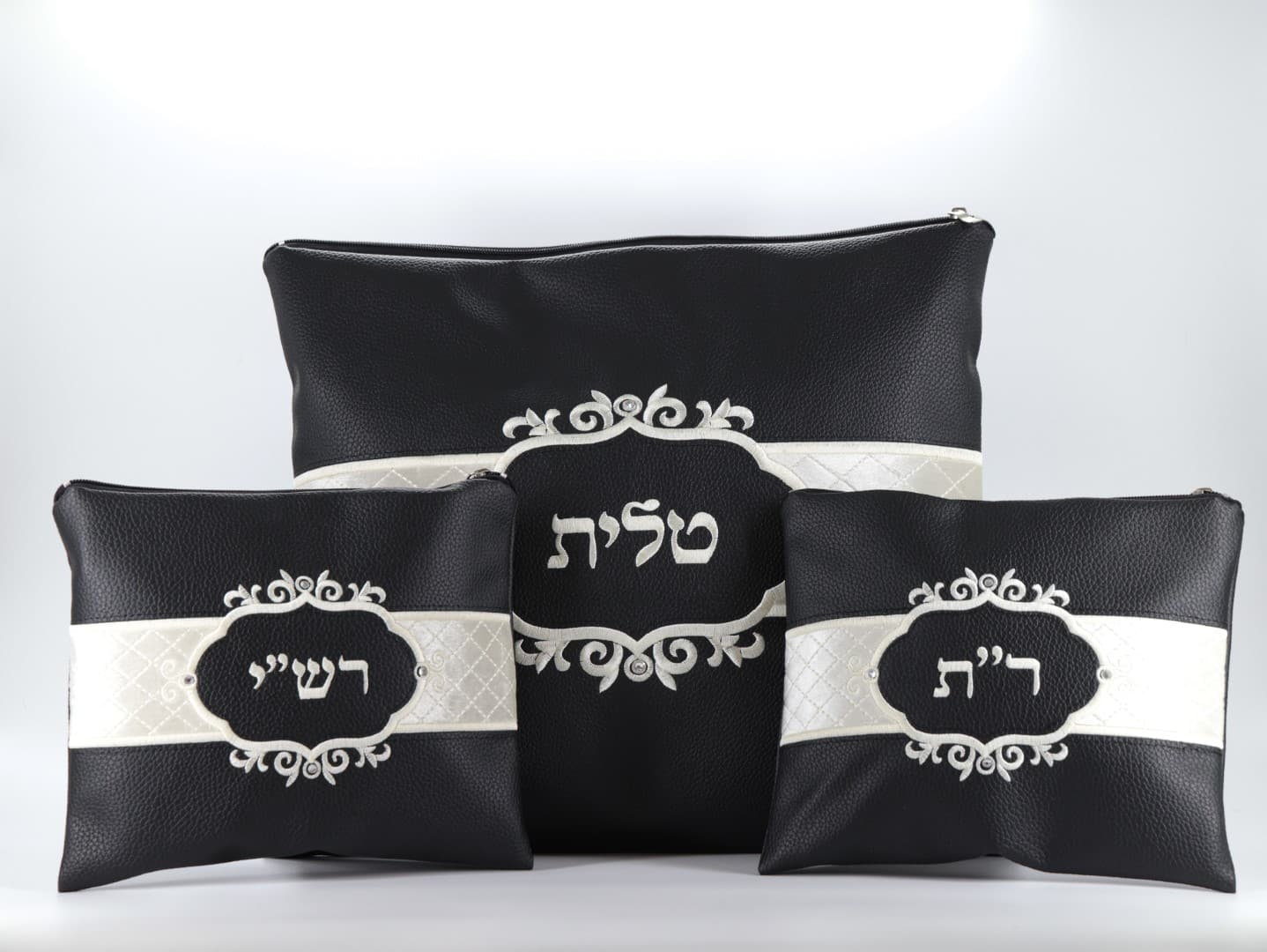 סט טלית תפילין רשי-תם דמוי עור שחור ולבן עם עיטור קטיפה וריקמה